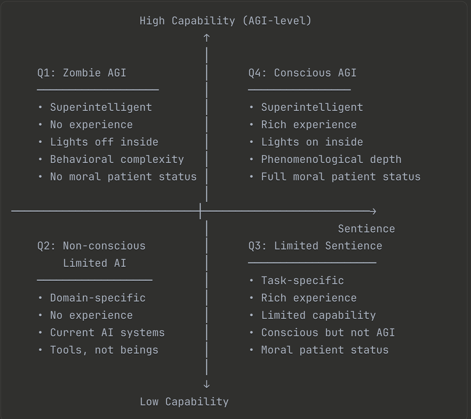 These dimensions are orthogonal: systems can be highly capable without being sentient (zombie superintelligence), or sentient without being generally intelligent (conscious but limited systems). This document clarifies these distinctions and explores three valuable categories of sentient systems that don't require AGI-level capabilities.